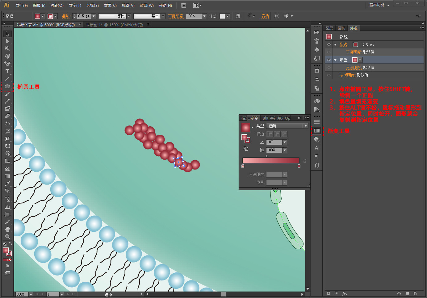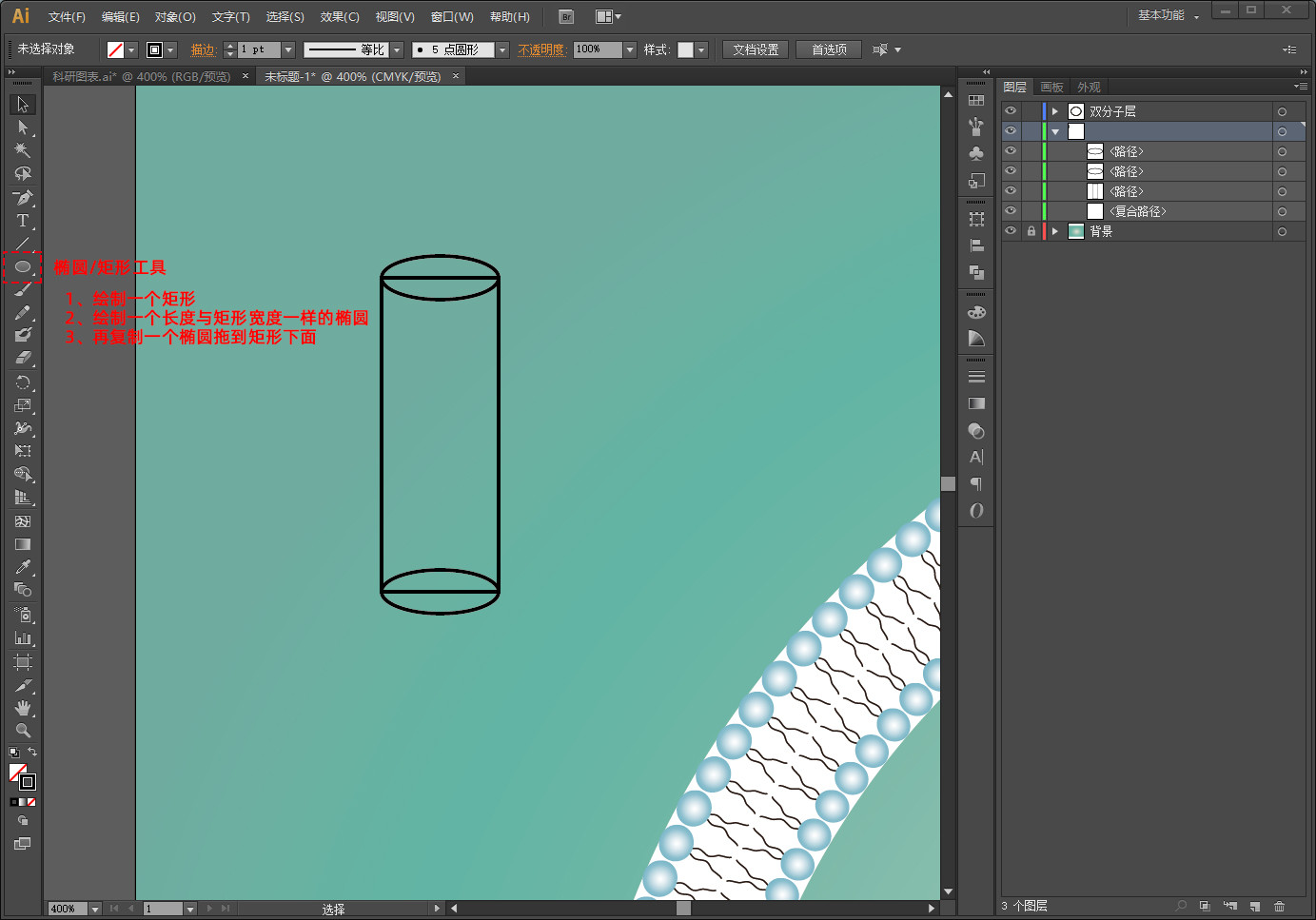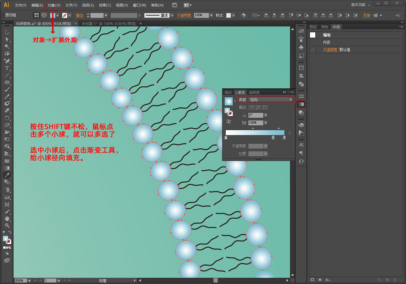 点击菜单栏中对象→扩展外观,然后点击右键,取消编组(这样就可以进一步修改双分子层圆球颜色了)