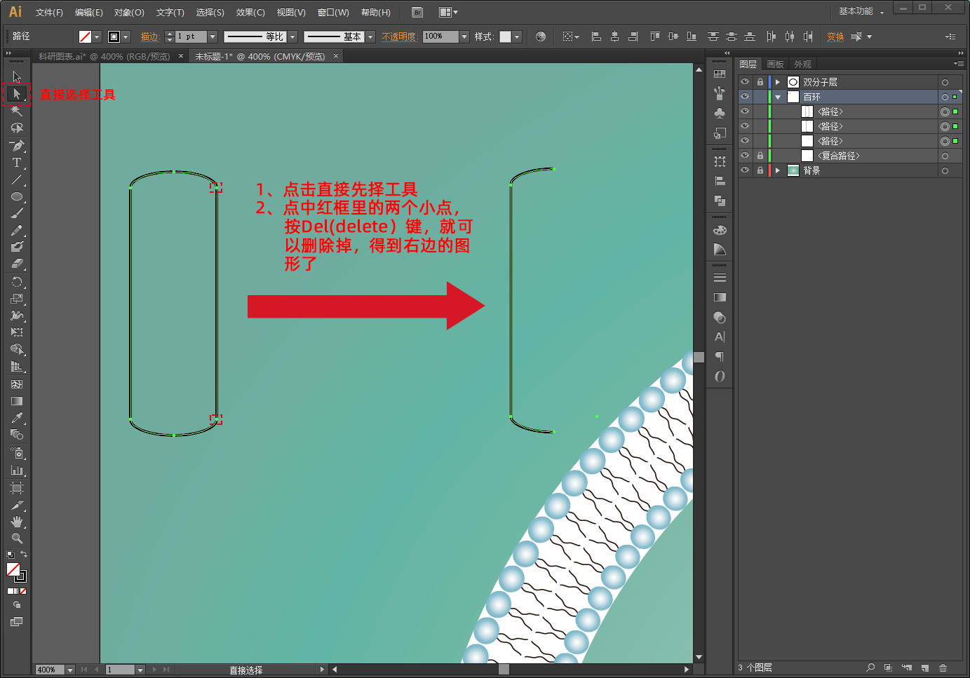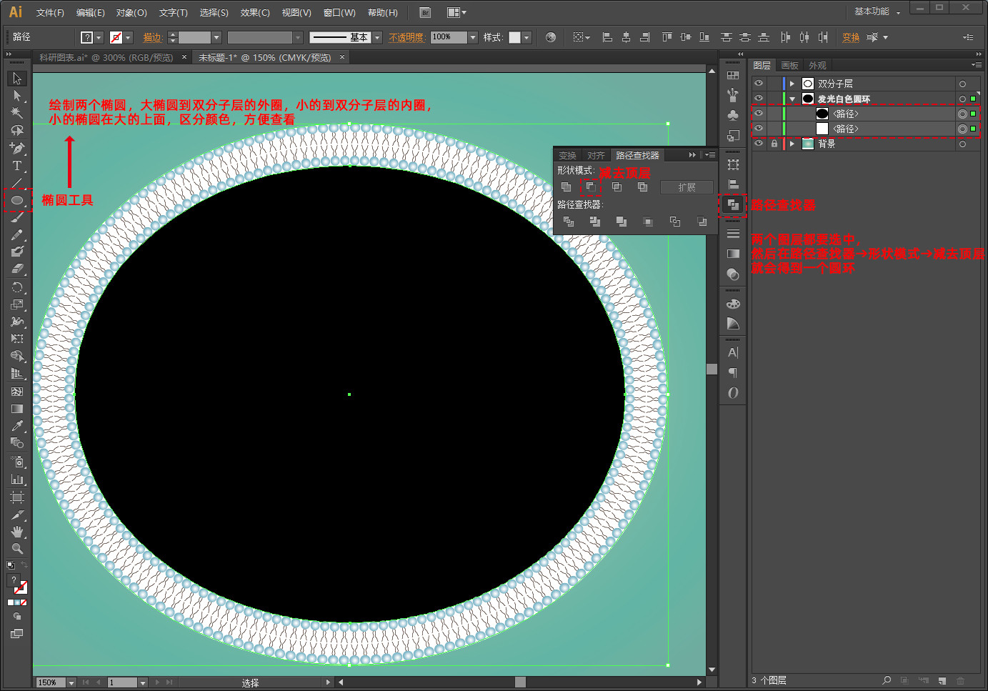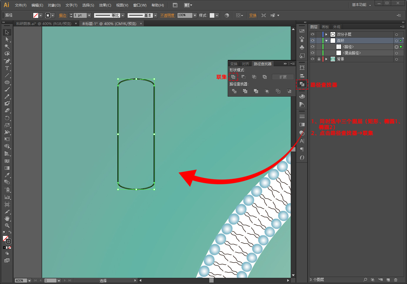 点击菜单栏中对象→扩展外观,然后点击右键,取消编组(这样就可以进一步修改双分子层圆球颜色了)