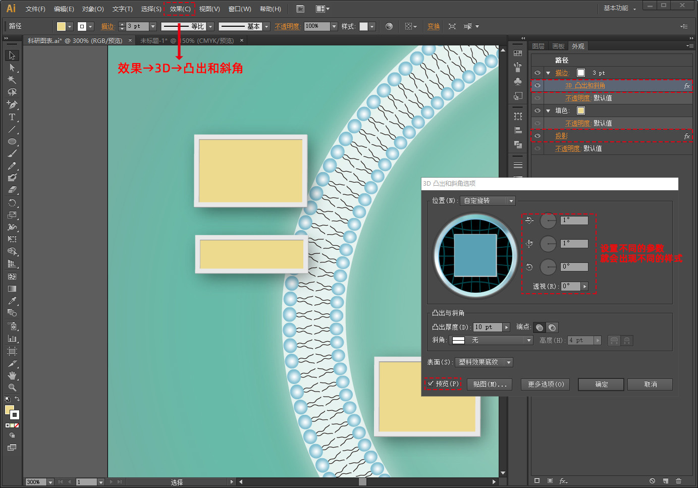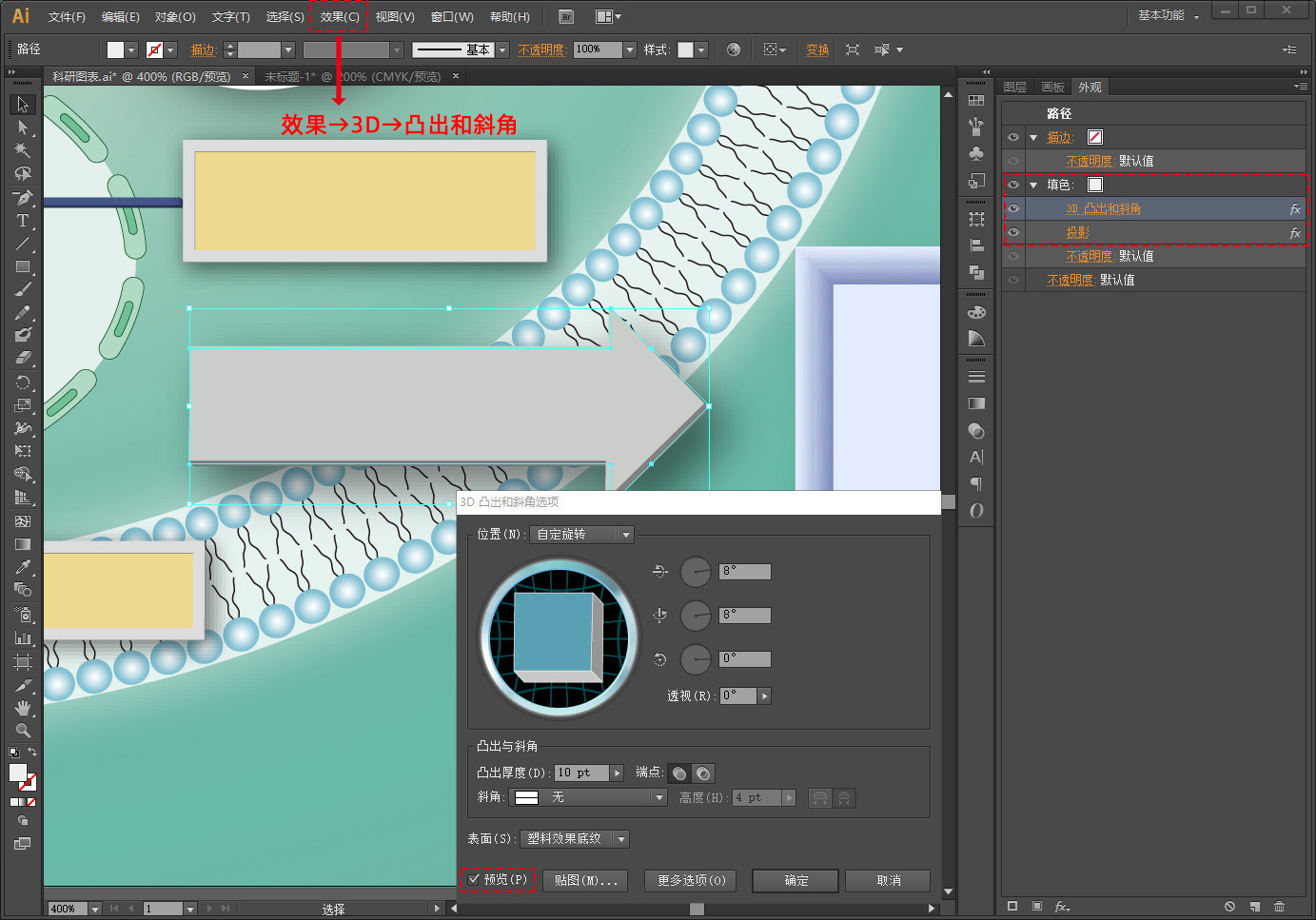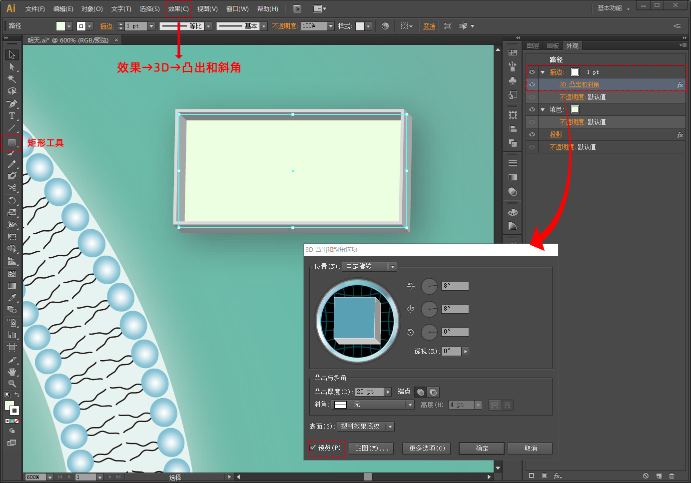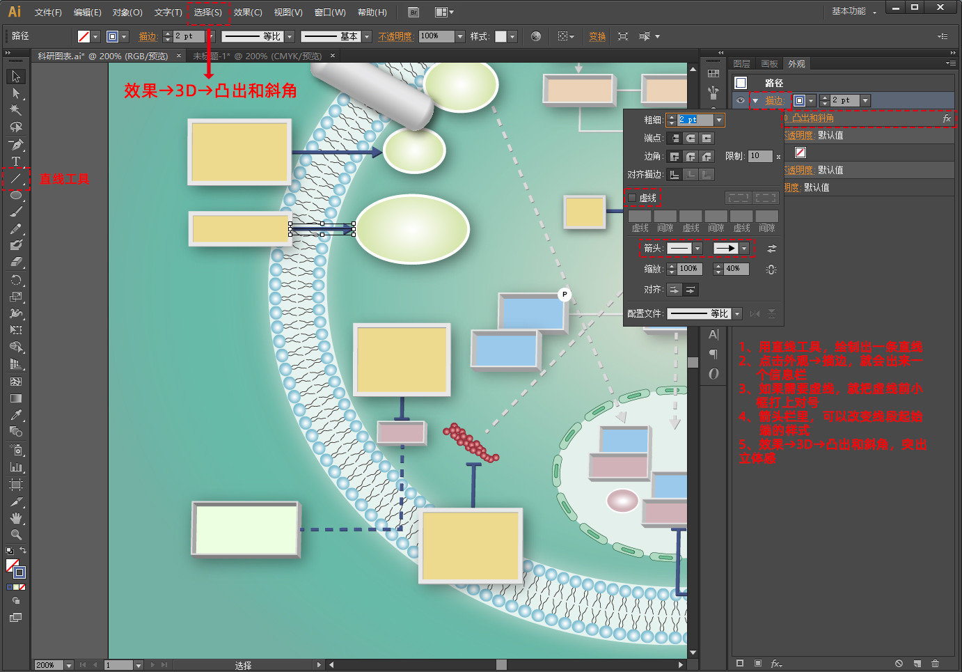 如果想要给指示线加立体感,点击菜单栏里效果→3D→凸出和斜角,调整角度就可以了
