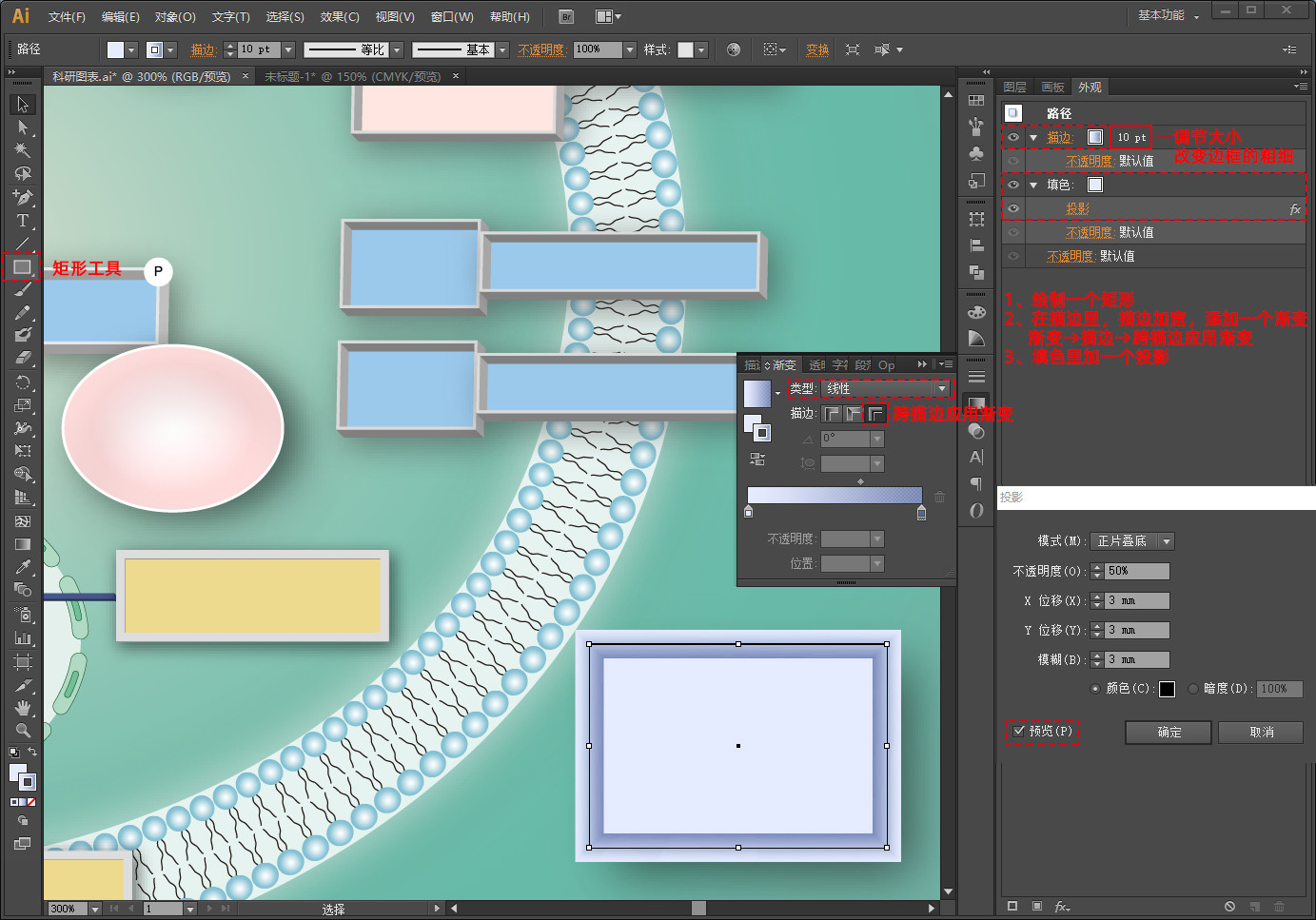 点击矩形工具,绘制一个矩形,描边加宽填充跨描边应用渐变,填色里添加一个投影