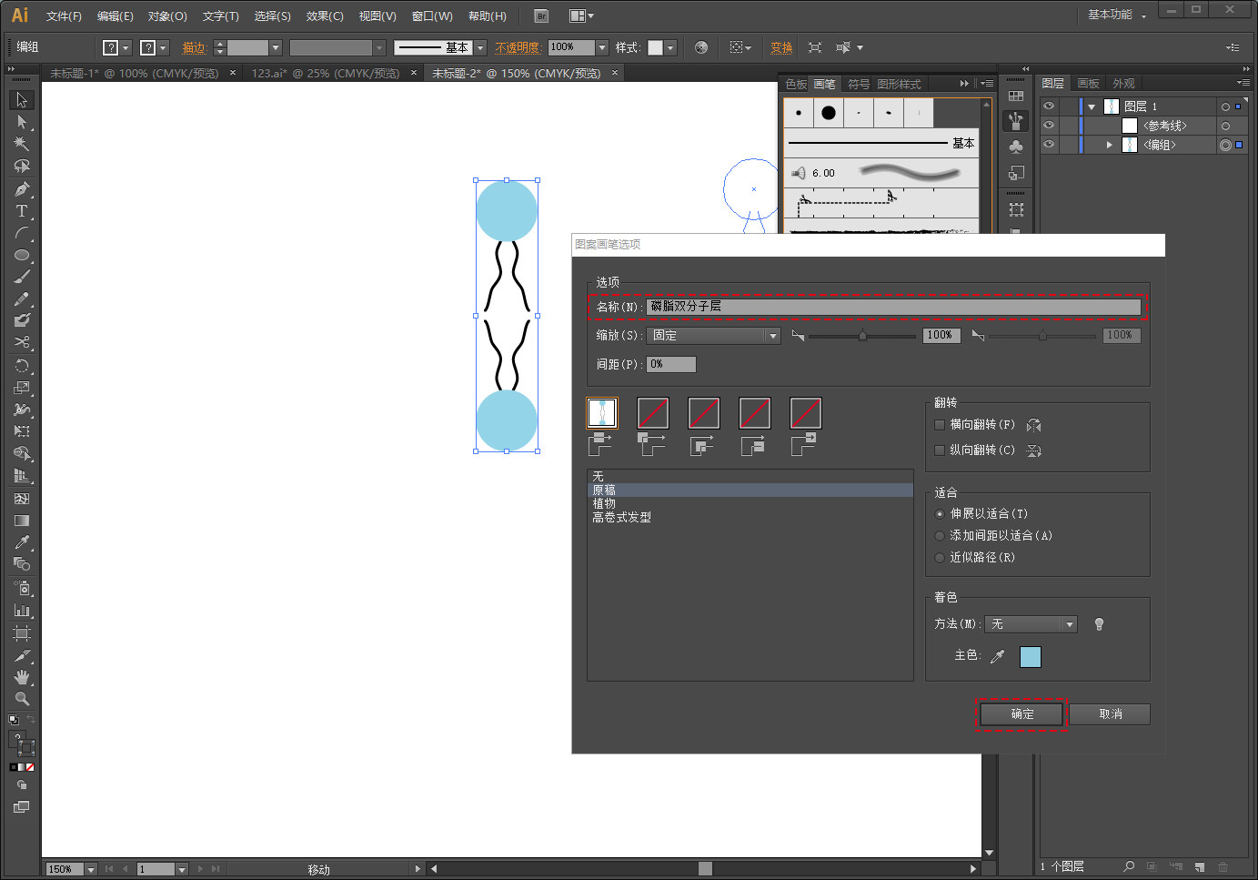 点击画笔工具里磷脂双分子层画笔,按住鼠标左键不松,把双分子层笔刷拖到椭圆的边框上,点击画笔框下 所选对象的选项 调整双分子层画笔大小。(这个椭圆不填充和描边)