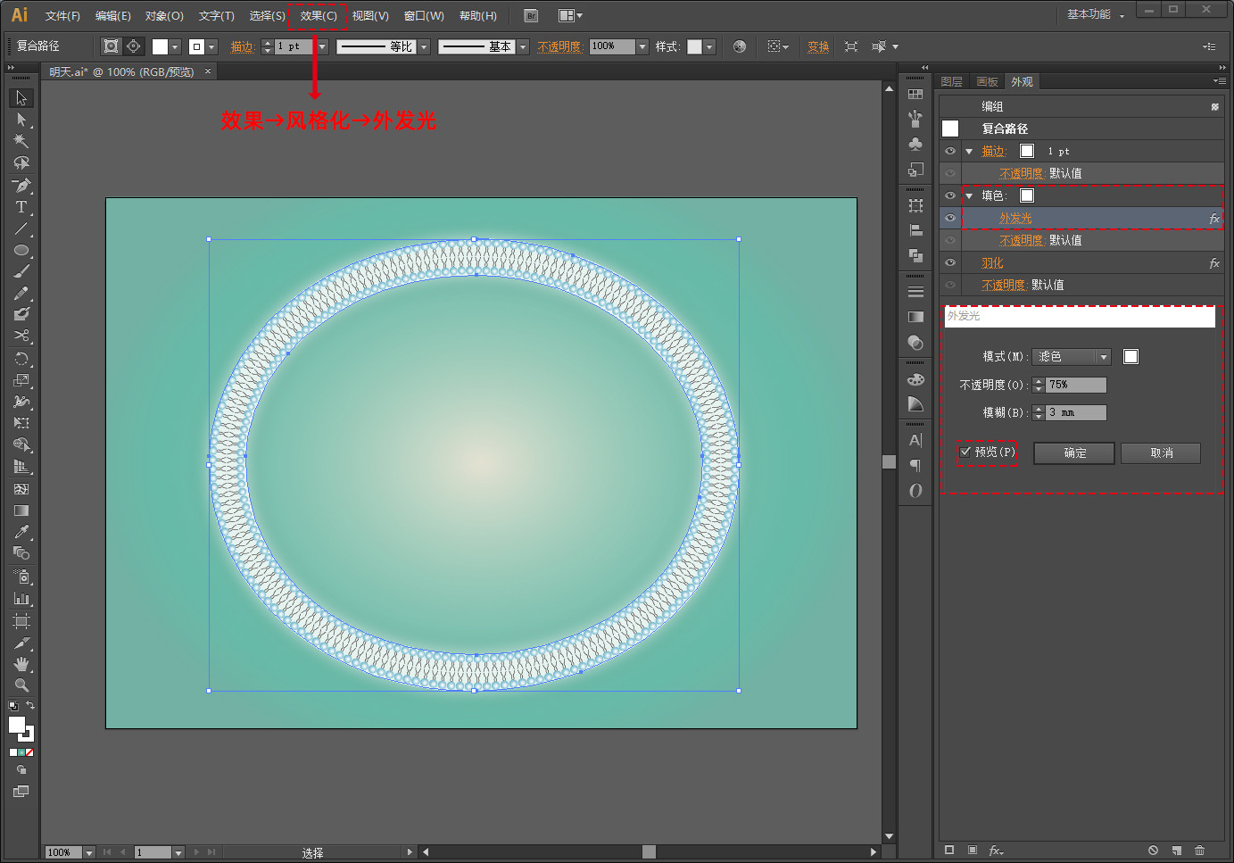 给圆环添加一个外发光,就会更加有立体感,效果→风格化→外发光