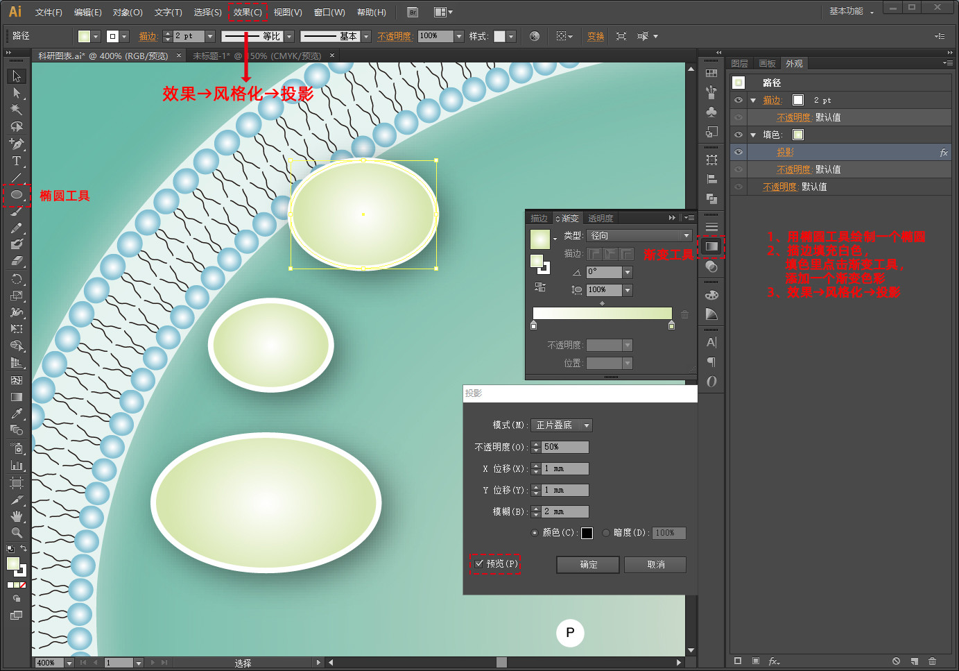 点击椭圆工具,绘制一个椭圆,渐变填充,加一个投影