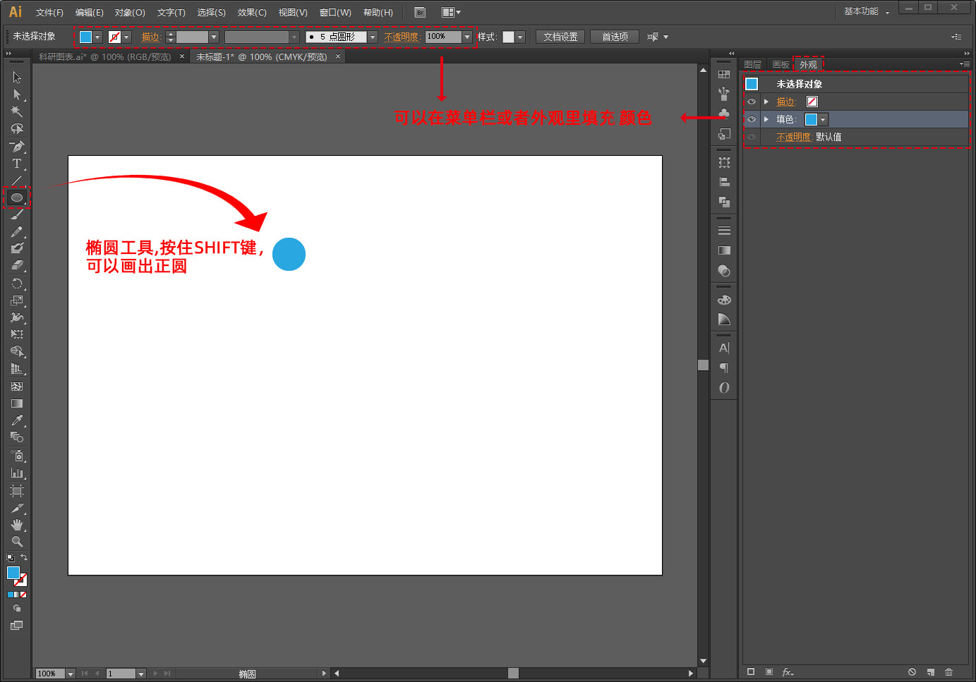 点击椭圆工具,按住SHIFT键,画出一个正圆,填充颜色,描边不填充。