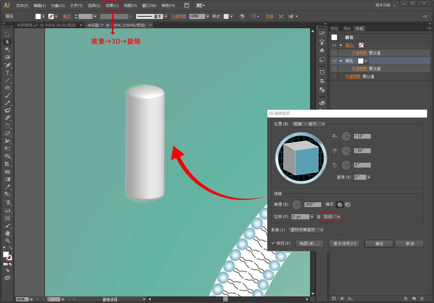 点击菜单栏里效果→3D→旋转,就会得到一个圆柱体