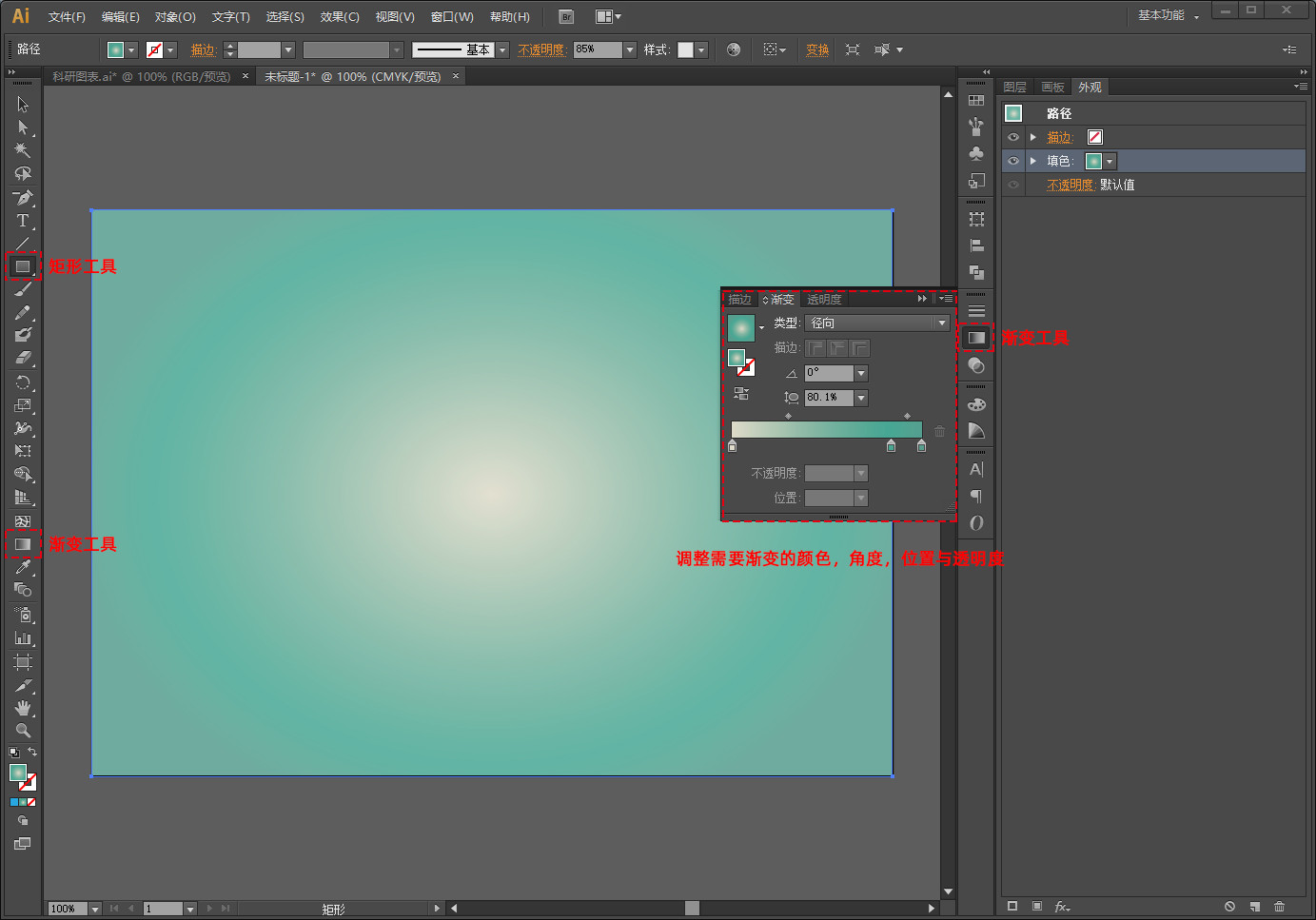 点击矩形工具,绘制一个跟画布一样大小的矩形,填充渐变色,描边不填充。