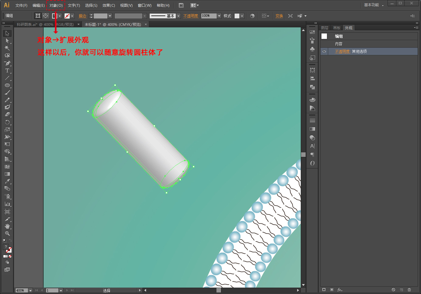 点击菜单里对象→扩展外观,这样就可以随意改变圆柱体的方向了