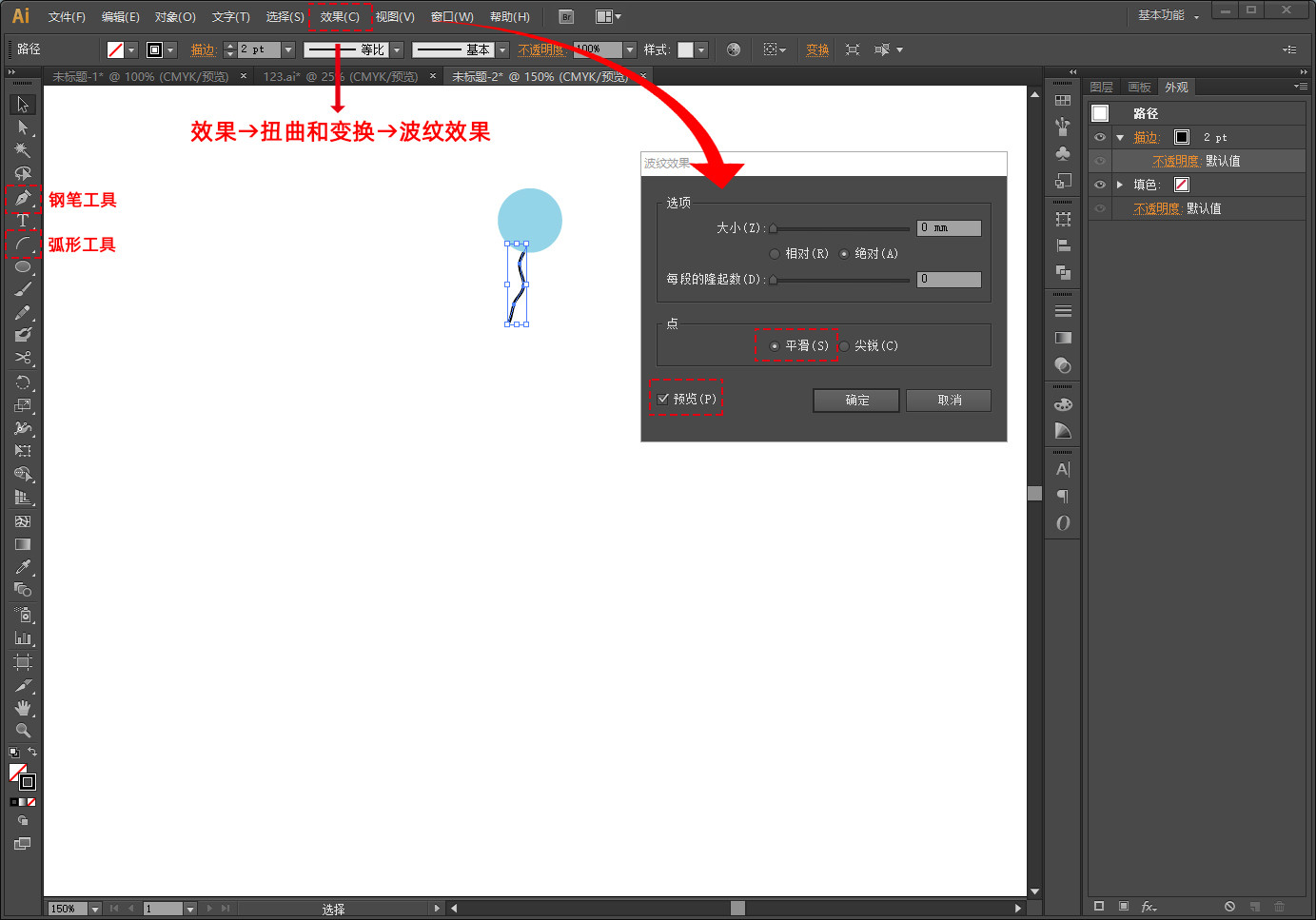 钢笔工具或弧线工具,绘制出一条线段;点击菜单栏里效果→扭曲和变换→波纹效果,设置参数,把左下角的预览勾选上。