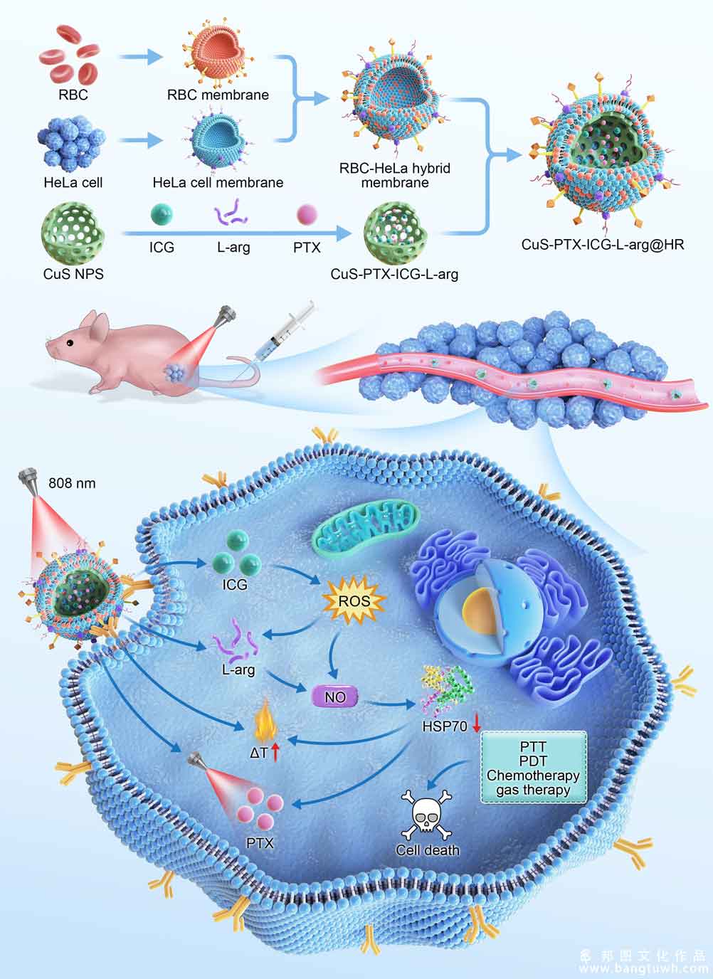 Chemotherapy resistance and the precise delivery as well as controlled release of drugs at tumor sites remain major challenges in cancer treatment. Heat shock proteins (HSPs) have been identified as key contributors to chemotherapy resistance, yet effective strategies to overcome this issue are still lacking. In this study, we developed a hybrid biomimetic nanoparticle system (CuS-PTX-ICG-L-arg@HR) that integrates photothermal therapy (PTT), chemotherapy, and gas therapy to enhance the efficiency of cervical cancer treatment. By fusing the red blood cell membranes with HeLa cell membranes, the nanoparticles combined immune evasion capabilities with tumortargeting properties, and further improved circulation time and tumor accumulation.