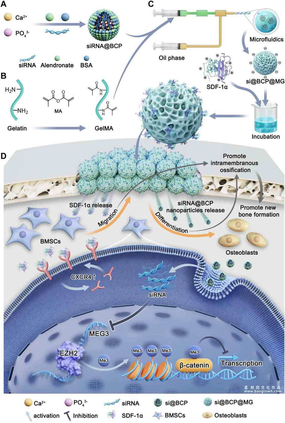 Critical-sized bone defects present significant clinical challenges due to insufficient stem cell recruitment, epigenetic suppression of osteogenesis, and inadequate mineralization. Among the epigenetic suppression mechanisms, upregulated MEG3 specifically recruits the epigenetic regulator EZH2 to block the transcription of β-catenin, a core gene for bone regeneration. To regulate MEG3 in vivo effectively, we used microfluidics to develop in situ continuous MEG3-silencing ossification micro-units (MSOMs) that integrate “material–gene–biofactor” tri-coupling into a unified biomaterial system. The MSOMs are nano-micro particles composed of amorphous calcium phosphate nanoparticles loaded with siRNA (si@BCP) in GelMA microgels loaded with stromal cell-derived factor-1α (SDF-1α).