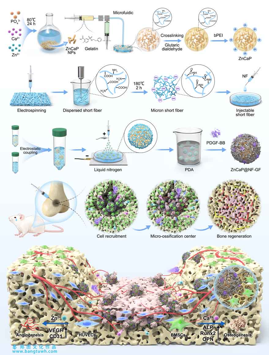 骨化中心是骨发育的基础,其生物学异质结构为骨组织再生提供了理想微环境;但在体内精准模拟其异质结构与功能仍具挑战。本研究利用电荷耦合与静电喷雾微流控技术,将无机/有机复合的掺锌磷酸钙矿化微球与模拟ECM的短纤维高度缠结,并通过π–π共轭与儿茶酚基团,使生长因子PDGF‑BB在短纤维微球上动态自组装,构建出可注射的仿生异质结构短纤维微球(ZnCaP@NF‑GF)。该材料表面形成独特纤维网络,可通过与ECM相互作用在骨缺损处实现长期锚定。PDGF‑BB经CXCR轴有效招募内源干细胞;持续释放的Ca²⁺显著通过MAPK/ERK途径诱导干细胞成骨分化;同步释放的Zn²⁺经ERBB/ERK信号促进新生血管形成。最终,ZnCaP@NF‑GF作为生物矿化“骨岛”的成核位点,促进了缺损部位的骨样沉积与重建。该策略为通过精确模拟骨化中心结构与功能以实现骨缺损再生提供了新思路。
