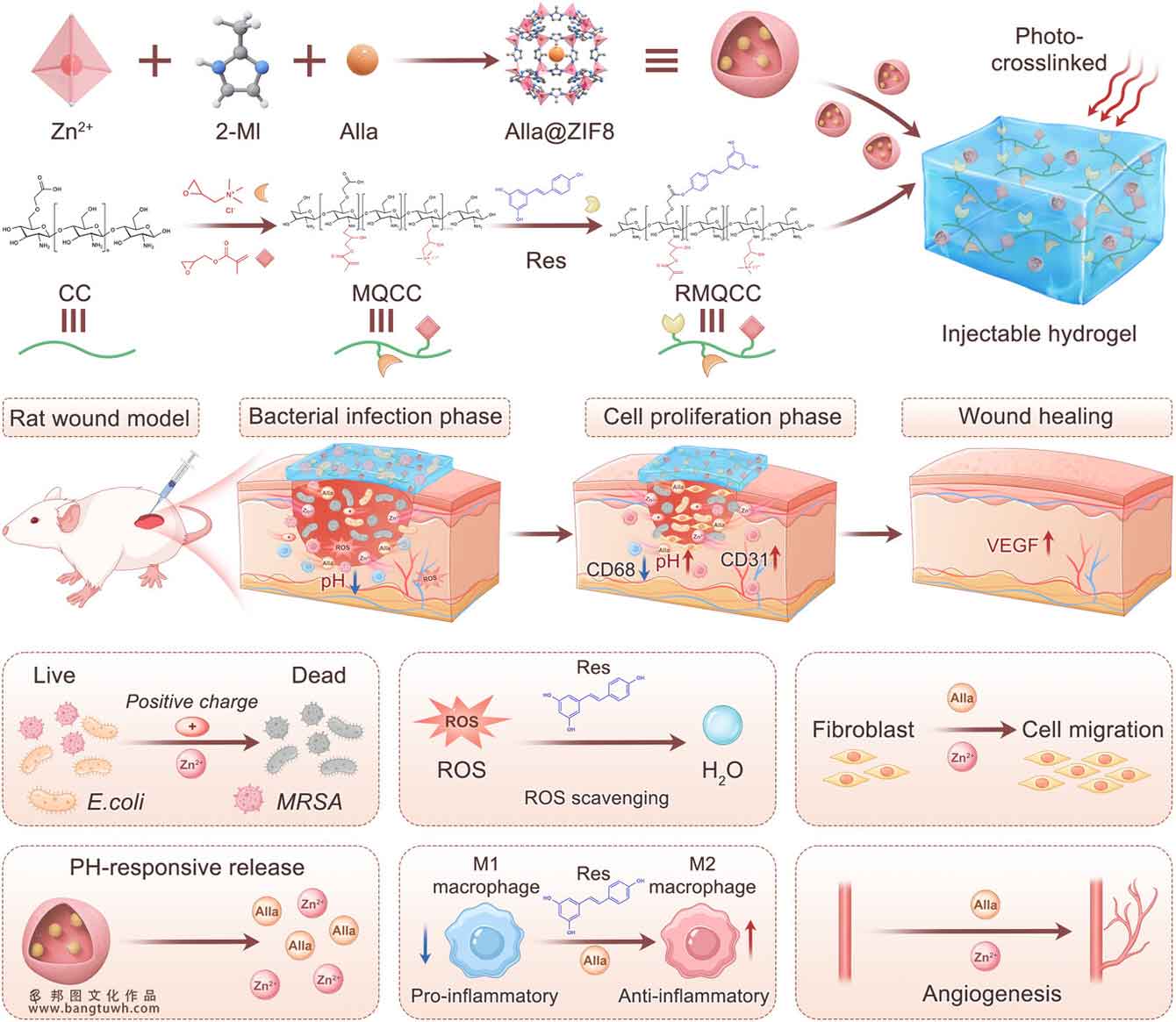 本研究基于载有秋兰姆酸的 ZIF8 纳米颗粒(Alla@ZIF8)以及甲基丙烯酰化季铵基羧甲基壳聚糖/白藜芦醇复合水凝胶(RMQCC),我们设计并开发了一种自适应多功能水凝胶系统(Alla@ZIF8-Gel)。这种纳米复合水凝胶具有多种智能特性,包括 pH 反应性和形态适应性。季铵基羧甲基壳聚糖赋予了良好的生物相容性和强大的抗菌性能。静电相互作用和氢键赋予了水凝胶出色的可注射性和自愈能力。ZIF8 纳米颗粒实现了秋兰姆酸的智能、按需释放,从而促进了组织再生。白藜芦醇具有强大的抗氧化、抗炎和免疫调节作用。Ala@ZIF8-凝胶能够根据伤口微环境动态调节药物释放速率,协同发挥抗菌、抗氧化、抗炎和组织再生等功能。体外和体内实验结果均表明,这种自适应水凝胶显著加快了耐甲氧西林金黄色葡萄球菌(MRSA)感染伤口的愈合,抑制了细菌增殖,减轻了氧化损伤和炎症反应,并促进了胶原蛋白沉积、上皮再生和新生血管形成。这项工作为开发用于感染伤口管理的智能、多功能治疗材料提供了一种新的设计思路,具有显著的临床应用转化潜力。