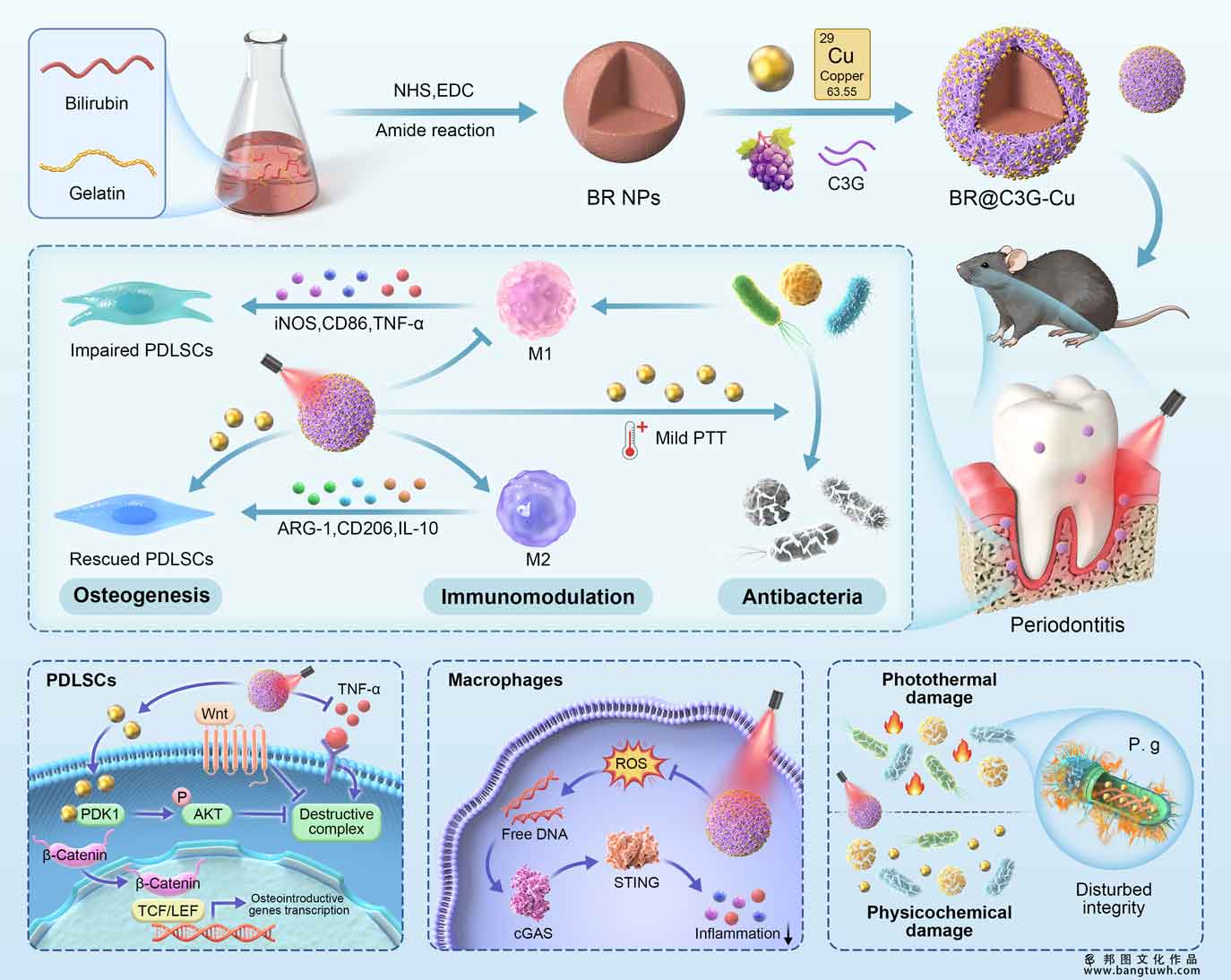 Based on the intricate pathogenesis of periodontitis and the advantages of mild photothermal therapy (PTT) and nanotherapy, a multifunctional photothermal nanoplatform (designated BR@C3G-Cu) was rationally developed by coating bilirubin nanoparticles (BR NPs) with copper ion coordinated cyanidin-3-O-glucoside metal-polyphenol networks (MPNs) in this study. The synergistic consequences of the photothermal conversion properties and metal-dependent functionality of this MPNs contributed to the effective and persistent elimination of periodontal pathogens under safe and mild conditions, meeting the heterogeneous antibacterial requirements of periodontitis.
