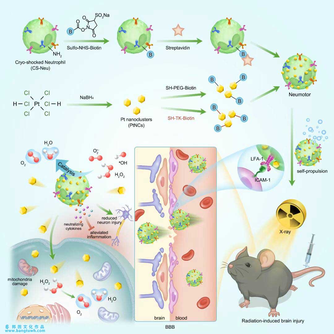 电离辐射(包括 X 射线、γ 射线等)在核事故、肿瘤放疗等场景中广泛存在,其引发的急性放射病以损伤重、进展快、死亡率高为特征。中枢神经系统对辐射尤为敏感,可触发氧化应激、神经炎症及血脑屏障(BBB)破坏,导致放射性脑损伤(RIBI),患者容易出现认知衰退、脑萎缩甚至肿瘤等严重病症。研究表明,辐射产生的过量自由基是导致放射性脑损伤的主要原因。然而,目前临床上尚无有效的放射性脑损伤治疗药物。尽管纳米催化剂介导的催化疗法是治疗氧化损伤的有力工具,但现有的纳米催化剂靶向性差,难以穿透血脑屏障,在治疗中效果有限。因此,迫切需要开发新的治疗药物,以提高放射性脑损伤的精准性和疗效。中性粒细胞作为体内数量最多的白细胞,具有跨血脑屏障和炎症靶向性。刘鉴峰研究员团队利用液氮冷冻技术获得冷冻休克中性粒细胞(CS-Neu)来作为药物载体,解决了活中性粒细胞作为载体时药物易被吞噬分解以及加剧炎症反应的问题。同时,与使用中性粒细胞膜或囊泡包裹药物的方法相比,冷冻休克中性粒细胞避免了膜蛋白在物理破碎过程中大量丢失的问题,保留了完整的细胞膜结构,从而维持了炎症靶向性。通过在冷冻休克中性粒细胞表面装饰铂纳米簇(PtNCs),构建了金属装甲修饰的中性粒细胞微马达(Neumotor)。中性粒细胞微马达具有多酶模拟活性、活性氧(ROS)响应性释放铂纳米簇以及自推进功能。在活性氧丰富的微环境下,部分铂纳米簇能够从中性粒细胞微马达表面脱落,实现对细胞内自由基的清除。此外,铂纳米簇催化分解H2O2产生大量O2,实现了中性粒细胞微马达在生理环境中的自推进运动,提高了其与自由基的接触机率,进一步增强了自由基清除效率。结果显示,中性粒细胞微马达能够有效穿过血脑屏障,进入脑组织,并在脑部炎症部位积累,显著减轻了辐射引起的氧化应激、神经炎症和血脑屏障破坏,改善了放射性脑损伤小鼠的认知和记忆功能障碍。本研究不仅为中性粒细胞的应用提供了新的方向,也为放射性脑损伤的催化治疗提供了新的思路和方法。